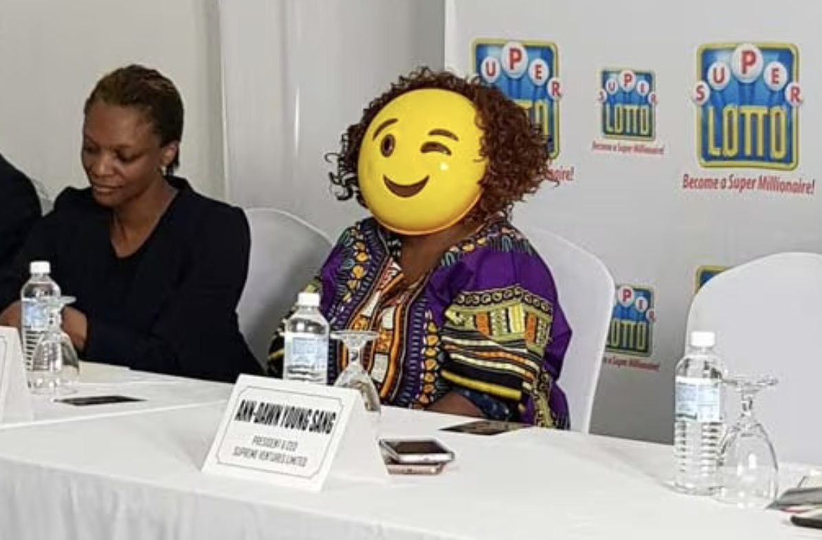 The masked winner emerged in early June 2018 at an official presentation arranged by Supreme Ventures Ltd., the operator of the Super Lotto game. She arrived at the venue wearing a large yellow mask with a winking emoji face. Behind the disguise, the woman signed paperwork and posed for photographs as representatives unveiled her prize check. Snack-sized social media posts by the lottery company, including images of her wearing the mask, quickly went viral.
